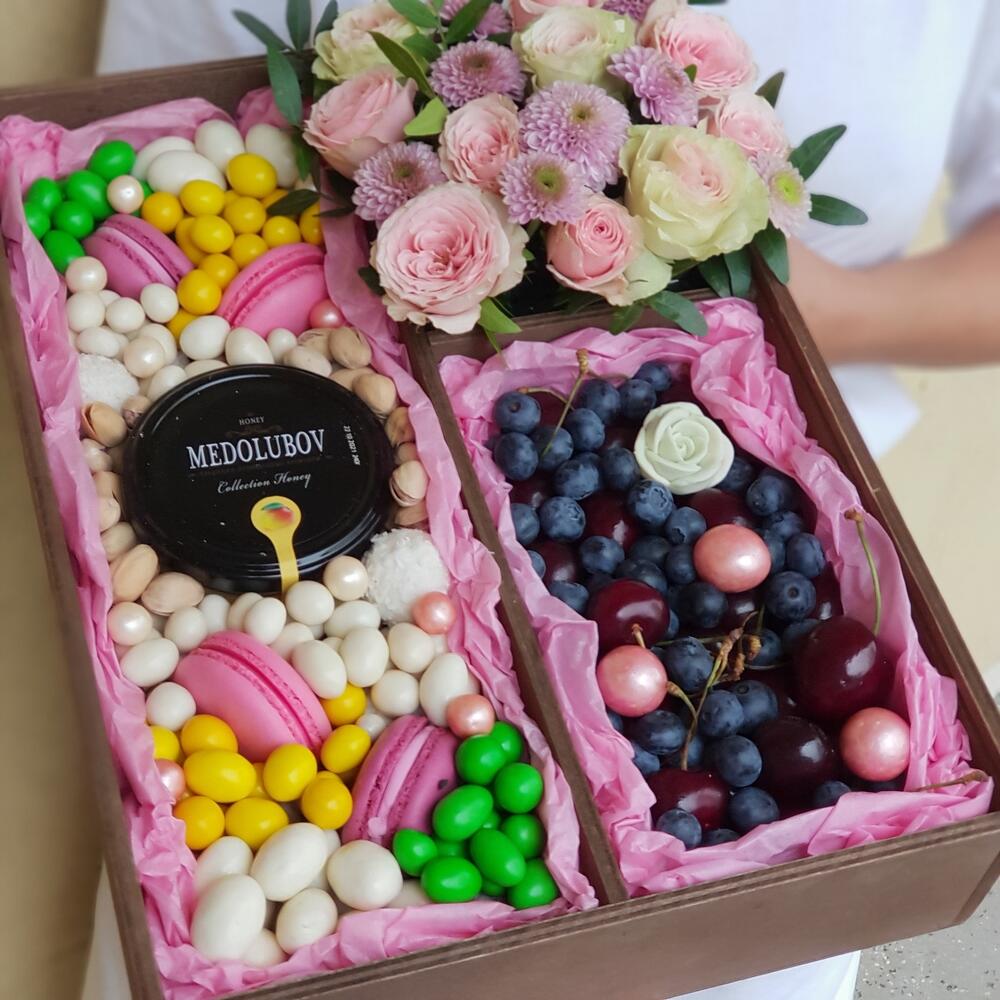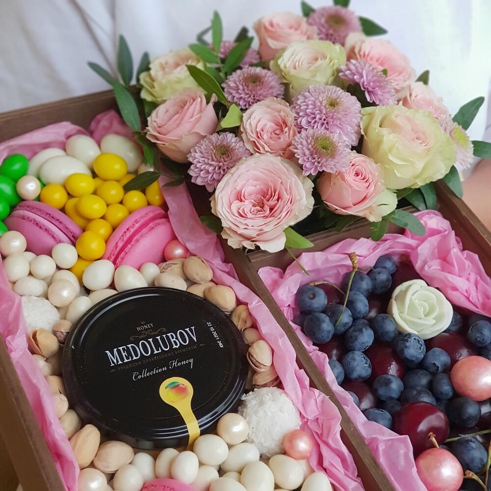 Роза кустовая – 3 шт.Хризантема Сантини – 1 шт.Конфеты Raffaello – 2 шт.Фисташка – 1 шт.Зефир в шоколаде – 5 шт.Голубика – 100 гр.Черешня – 280 гр.Пирожные макарон – 4 шт.Роза шоколадная – 1 шт.Фисташки – 30 гр.крем мед medolubov – 240 гр.банан сушеный – 150 гр.кешью в белом шоколаде – 100 гр.арахис в сахарной глазури – 140 гр.арахис в кунжуте – 140 гр.смородина в шоколаде – 20 гр.арахис в белом шоколаде – 100 гр.арахис в цветной глазури – 160 гр.рисовые шарики в шоколаде – 10 гр.транспортировочный крафт пакет – 1 шт.
