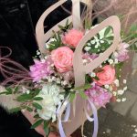 Сумочка – 1 шт.Роза кустовая – 1 шт.Хризантема кустовая – 1 шт.Гвоздика – 3 шт.Гипсофила – 1 шт.зелень декоративная – 1 шт.Сухоцветы – 1 шт.Оазис флористический – 1 шт.Лента атласная – 2 шт.