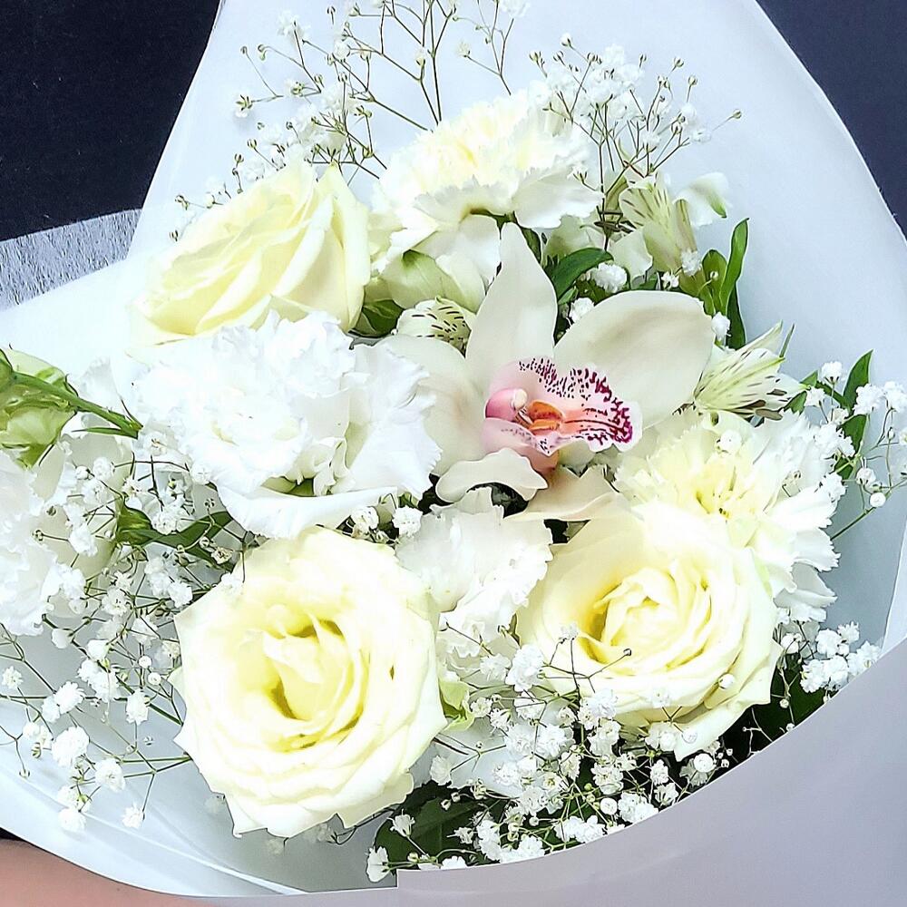 Альстромерия – 1 шт.Гипсофила – 1 шт.Лизиантус – 1 шт.Орхидея Цимбидиум – 1 шт.Роза кустовая – 1 шт.Роза – 3 шт.Гвоздика – 2 шт.Упаковка дизайнерская – 1 шт.