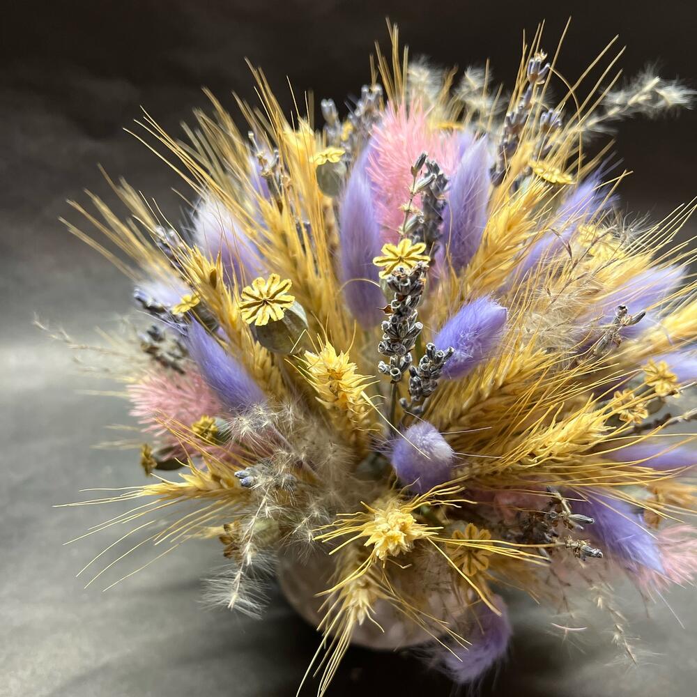 Колоски пшеницы – 20 шт.колосья мака – 10 шт.Лаванда (сухоцвет) – 15 шт.Лагурус (сухоцвет) – 20 шт.Кашпо керамическое – 1 шт.Оазис флористический – 1 шт.